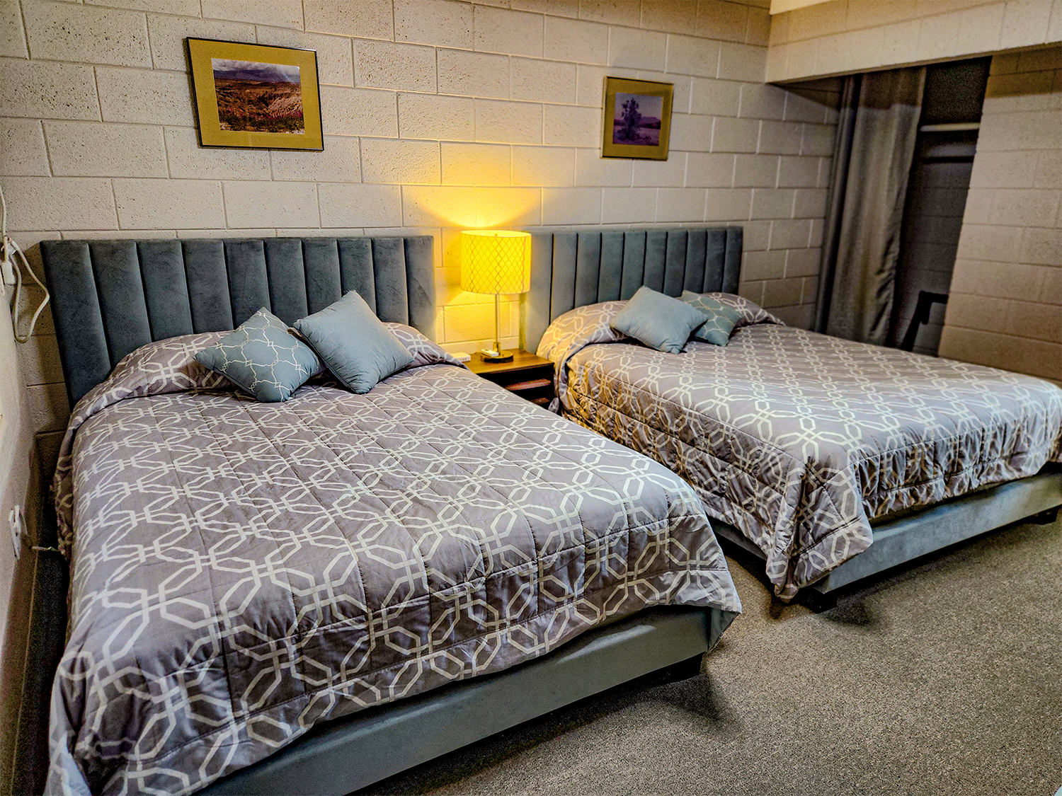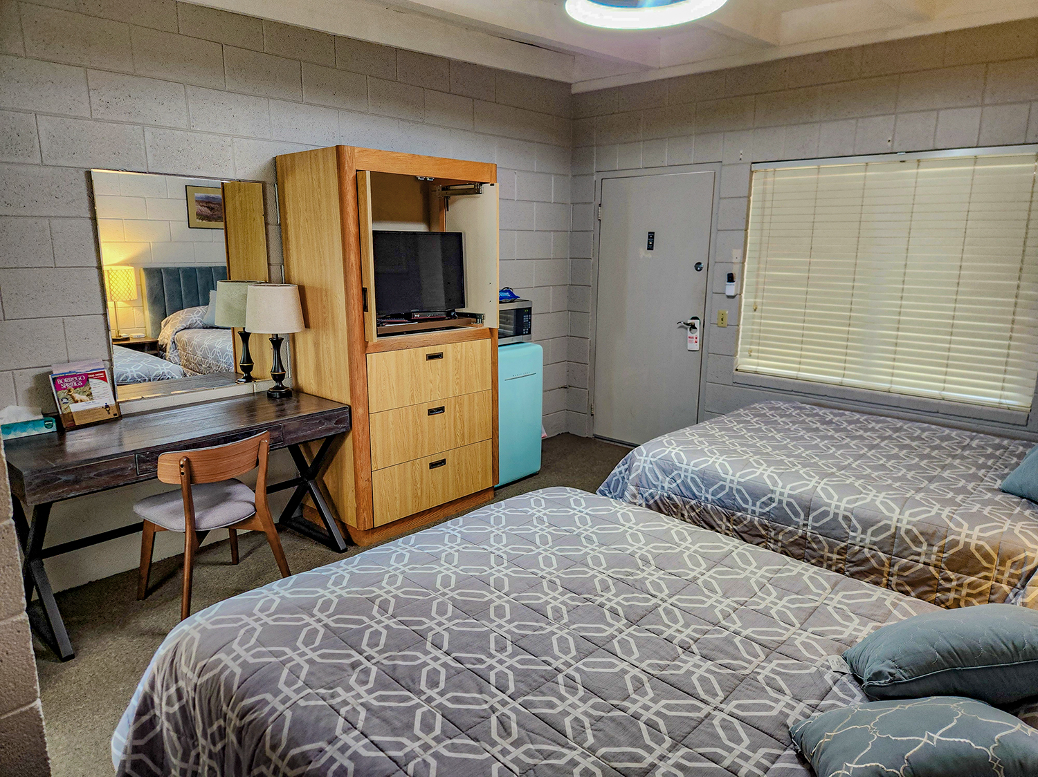 Cozy room with two Queen beds, small fridge, dining table, plus all standard room amenities.