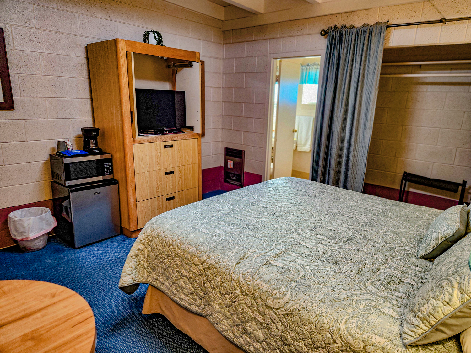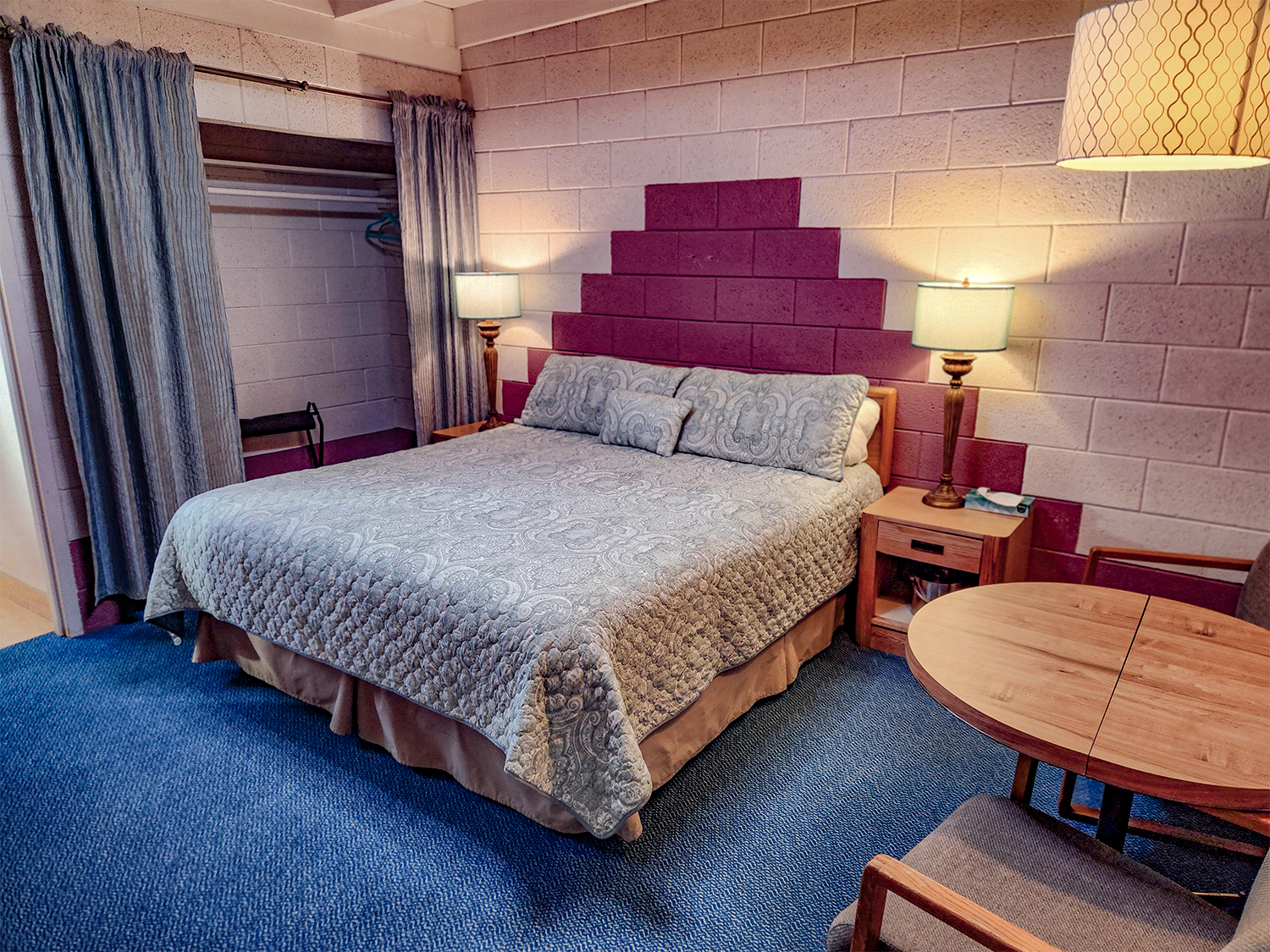 One King bed, ceiling fan, night stand, TV chair, small table, small fridge, plus all standard room amenities.