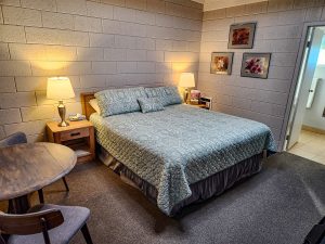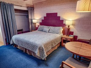 Cozy room with one King bed, ceiling fan, small table, night stand, fridge, plus all standard room amenities.