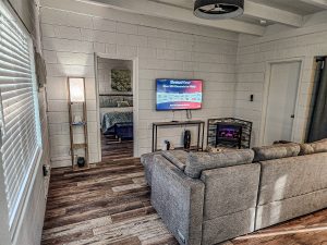 Colorful room with one Queen bed, one Twin day-bed, comfort lounge chair and ottoman, and large kitchenette, plus all standard room amenities. Dogs allowed.